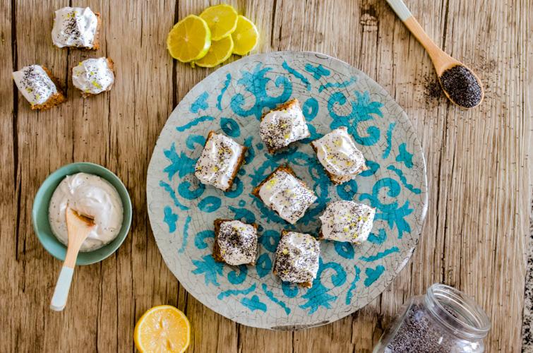 La crema de coco debe estar previamente refrigerada durante la noche. Agregarla en a un recipiente y comenzar a batir con una batidora eléctrica. Agregar unas 10 gotitas de stevia, jugo de un limón y una cucharada de semillas de amapolas. Batir hasta que espese. Una vez frío el bizcocho cortar en cuadrados y agregar una cucharada de crema sobre cada uno. Refrigerar 10 minutos y disfrutar!!!