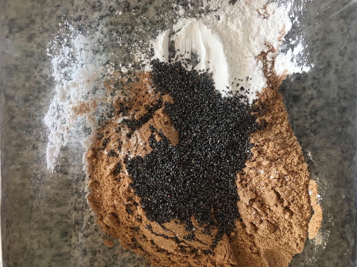 Pre calentar el horno. En un recipiente mezclar todos los ingredientes secos menos el endulzante o azúcar. Harina, una cucharada de semillas de amapolas y polvos de hornear.