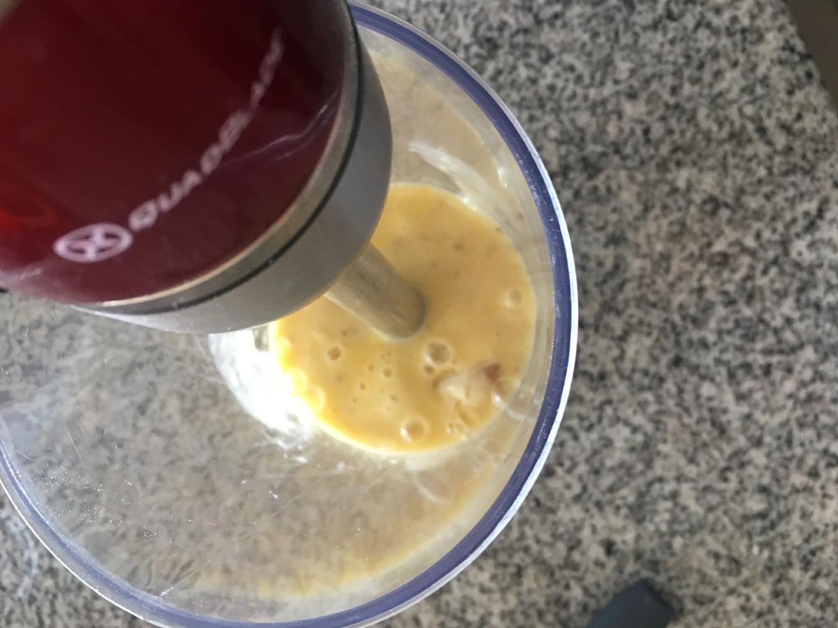 Exprimir el jugo de los dos limones y reservar. Moler el plátano con la ayuda de una Minipimer, luego agregar el huevo (o linaza previamente remojada) Seguir batiendo y agregar el azúcar de coco o el endulzante que usen y el jugo de limón. Batir todo bien y agregar a la mezcla de harina y semillas.