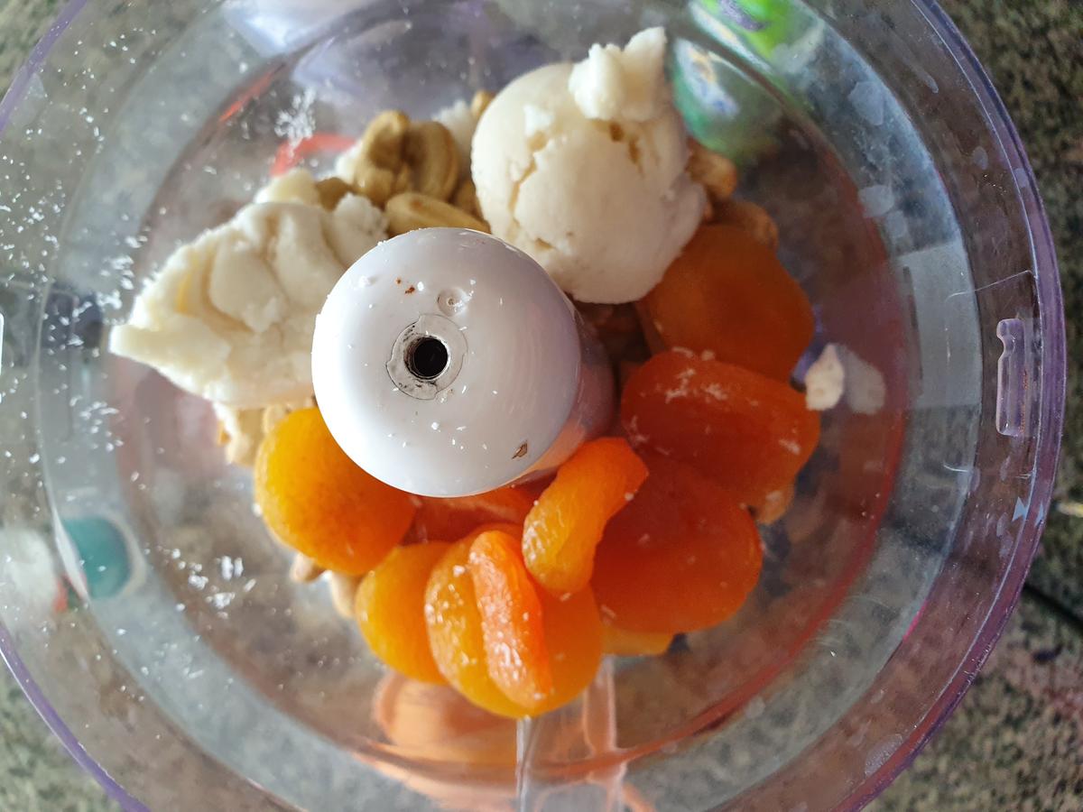 1.Poner el coco rallado, castañas de caju, mantequilla de coco y los damascos turcos en la procesadora. Procesar hasta lograr una pasta.