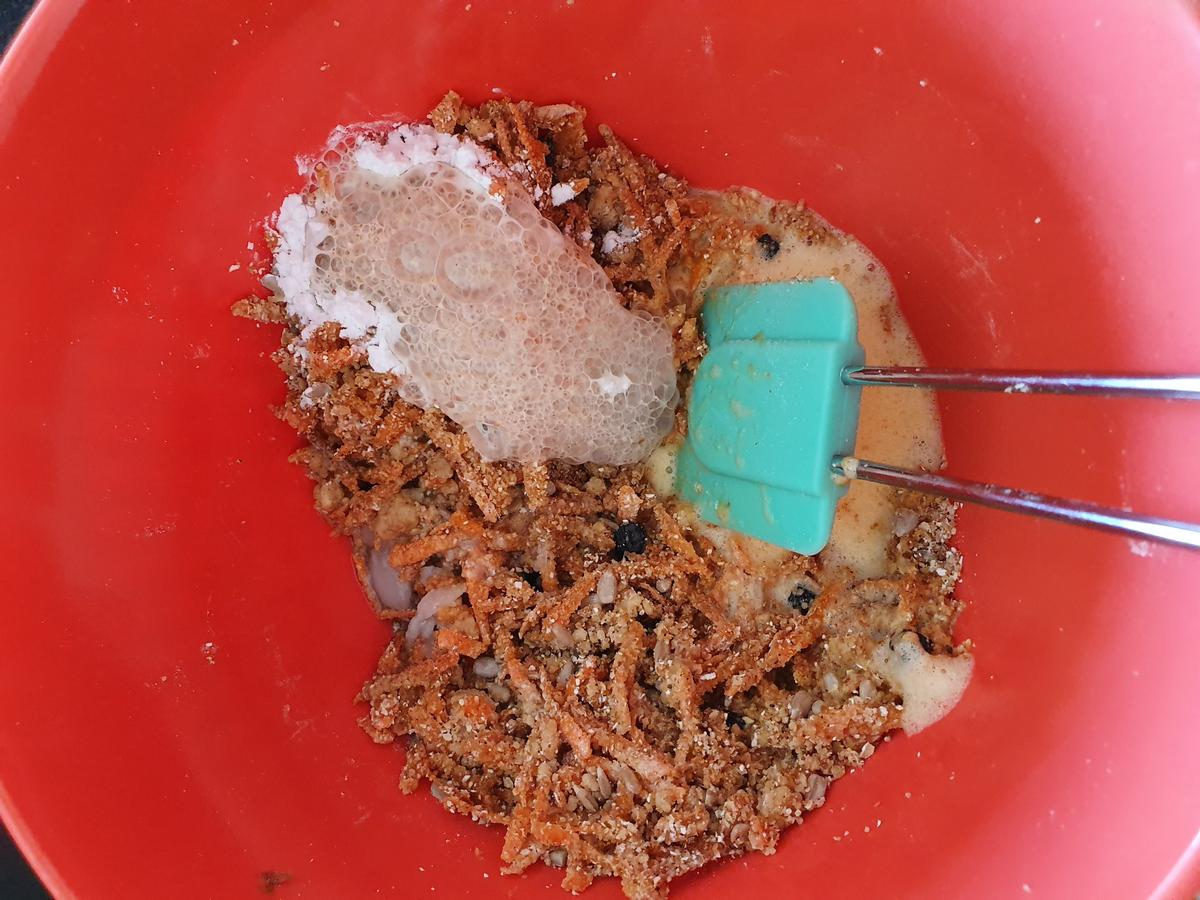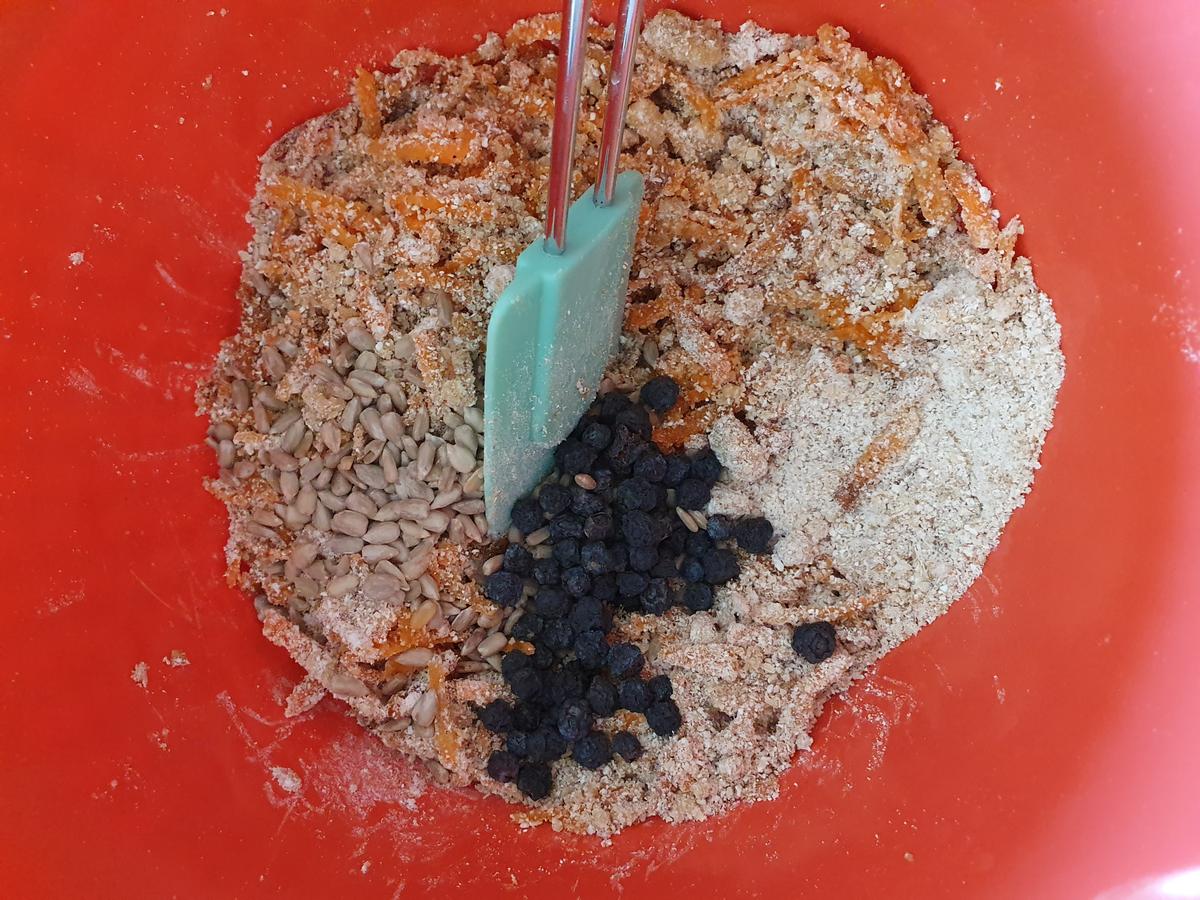 En un recipiente agregar las harinas, zanahoria rallada, azúcar de coco, canela, polvos de hornear, nuez moscada, clavo de olor, semillas y la fruta deshidratada. Mezclar bien.