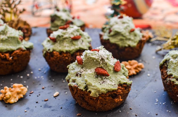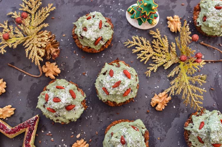 La cobertura color verde (frosting), la hice con castañas de cajú, previamente remojadas por al menos 4 horas, crema de coco y té matcha, que no solo aporta el color que necesitamos para nuestros arbolitos, si no también una buena dosis de antioxidantes. Pueden decorarlos con lo que quieran, yo utilicé bayas de goji y coco rallado.