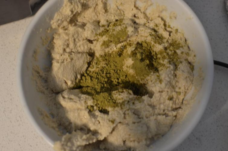4. Ponerlas en un recipiente y mezclarlo con el Té matcha, procesarlo una vez más con una batidora de inmersión (minipimer). Yo para lograr un color verde más fuerte, le agregué 3 gotitas de colorante verde para cocinar.