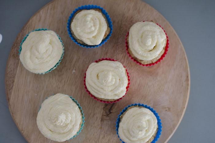 Una vez fríos, agregar el frosting a una manga o pueden hacer un pequeño corte en el extremo de una bolsa y usarlo como manga. Cubrir cada cupcake con el frosting. Para terminar pueden agregar cubitos de mango para decorar.
