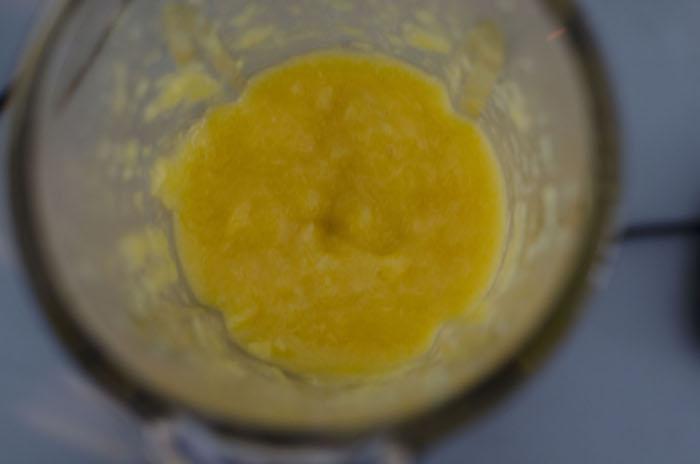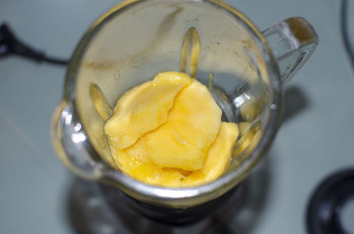 Pre calentar el horno. Pelar y picar el mango. Ponerlo en la licuadora