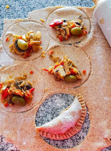 Para el relleno pueden preparar lo que ustedes quieran. Yo las hice con un pino de verduras muy sencillo, cebolla, pimentón y champiñones, y les puse una aceituna en cada empanada. Lo clave en el pino es el ajo, cómino y ají de color o parprika, estas con las especias que le dan ese toque bien Chileno!