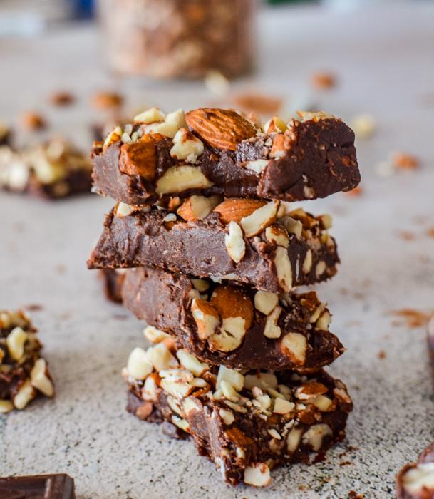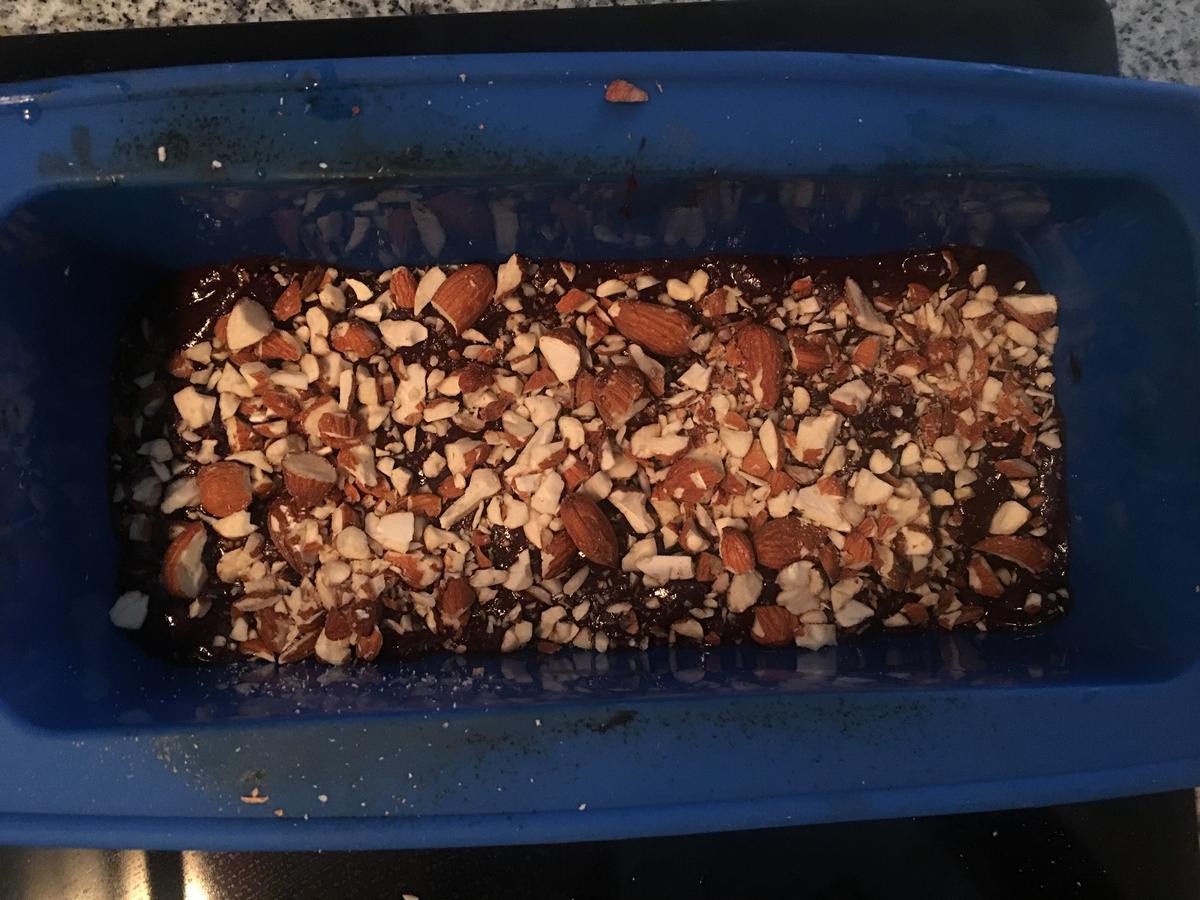 Traspasar la mezcla a un molde de silicona y agregar la otra mitad de almendras encima. Poner en el congelador unos 20 minutos hasta que este suave y compacto. Mantener refrigerados.