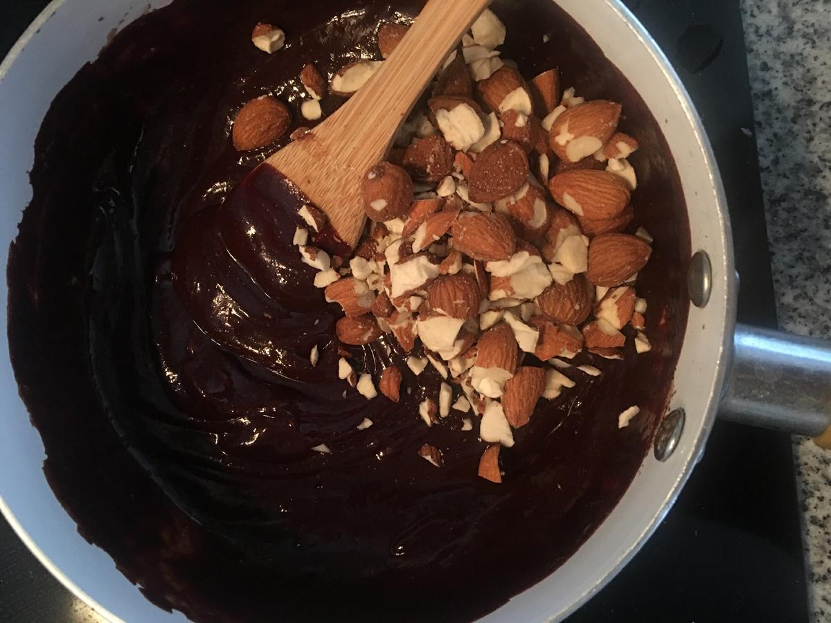 Picar las almendras. Agregar la mitad de almendras a la olla con chocolate y mezclar.