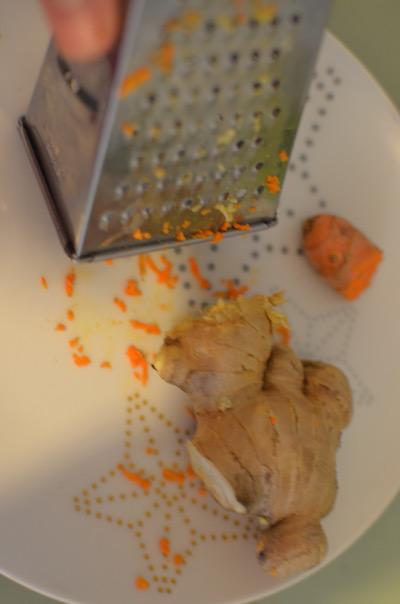 Rallar el jengibre y la cúrcuma. Si no encuentran la raíz de cúrcuma pueden usar una cucharadita en polvo.