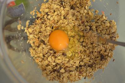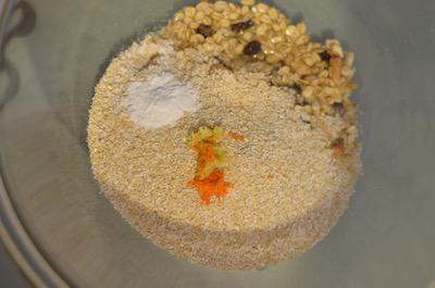En un recipiente mezclar, la harina de avena, la avena, aceite, jengibre, cúrcuma, canela, polvos de hornear, linaza remojada, pasas y las gotitas de stevia.
