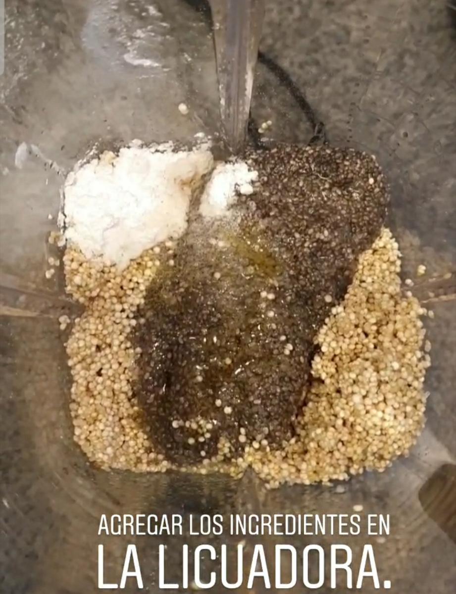 Licuar todos los ingredientes hasta lograr una pasta, intentar de que la quinoa quede completamente molida.
