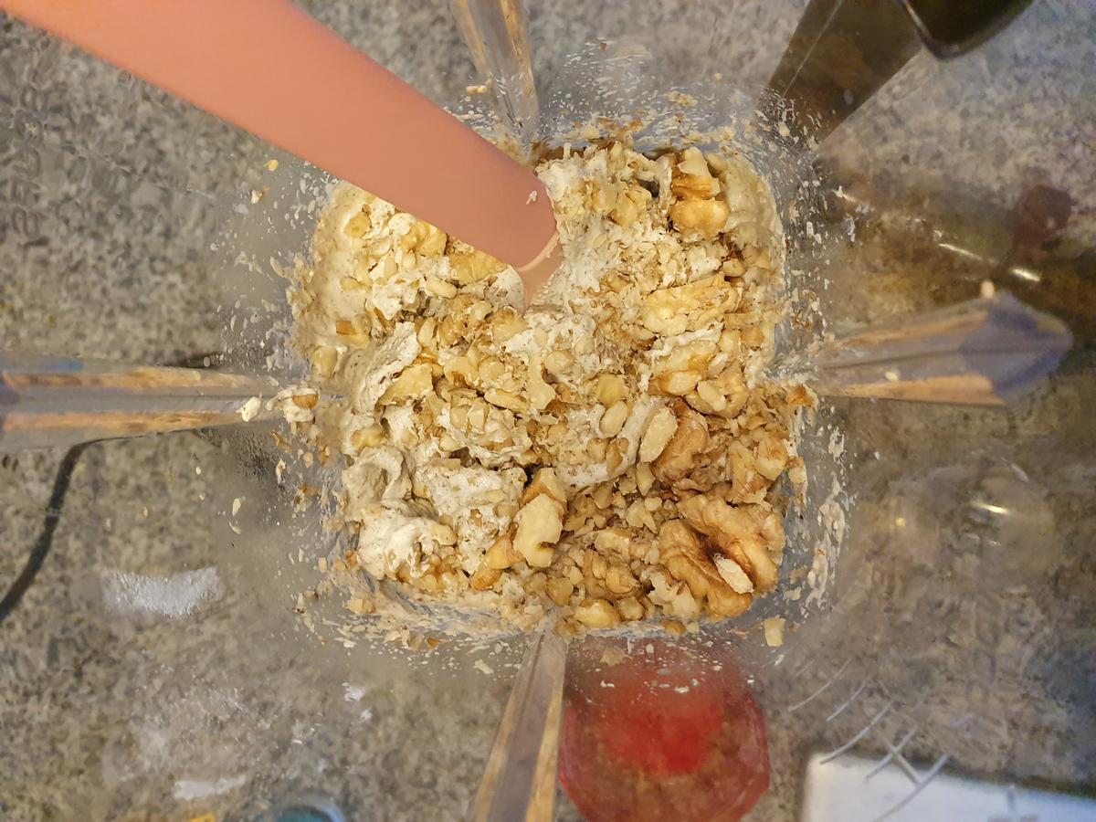 Picar las nueces y agregar a la mezcla. Mezclar bien. NO LICUAR. La idea es que las nueces no queden molidas si no picadas.
