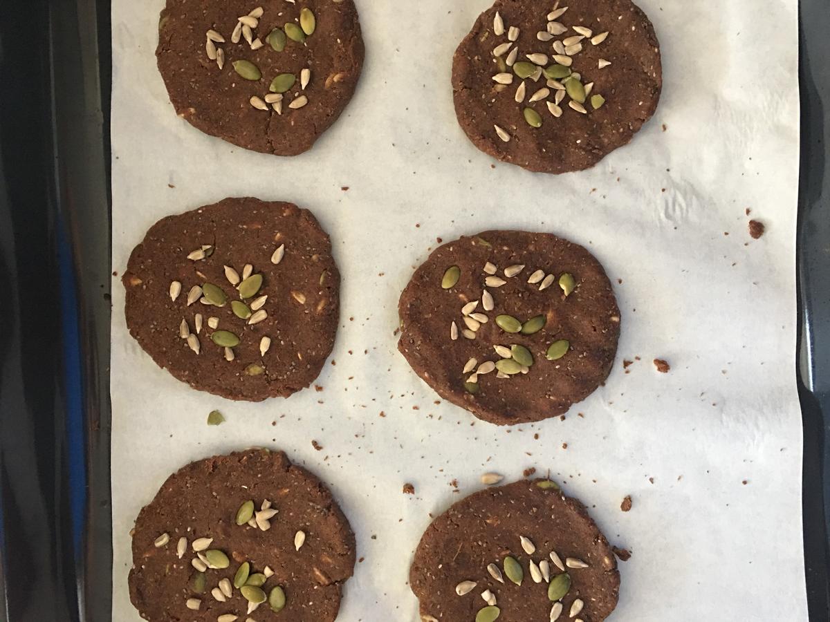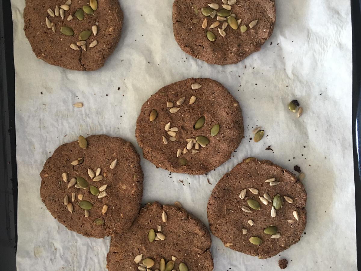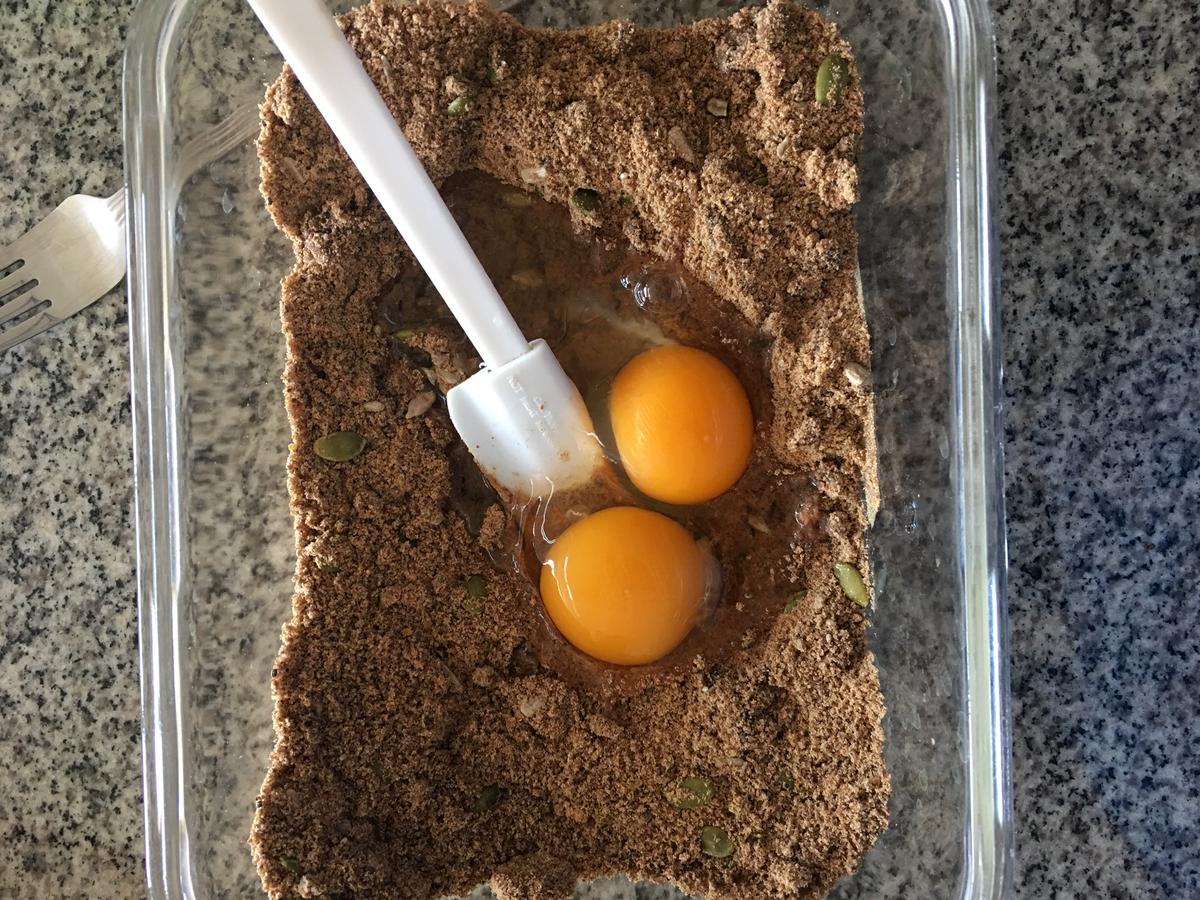 Pre calentar el horno. Primero mezclar las harinas, con las semillas, sal y aceite de oliva.