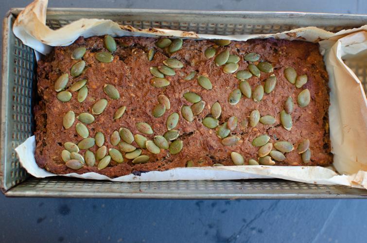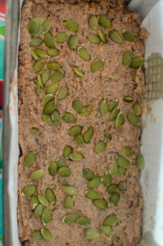 Pasado la hora, traspasar la mezcla del pan a el molde que van a usar. Poner aceite de oliva sobre el papel mantequilla para que no se pegue el pan. Si usan molde de silicona, no es necesario el papel mantequilla, solo un poquito de aceite. Agregar algunas semillas sobre la mezcla.