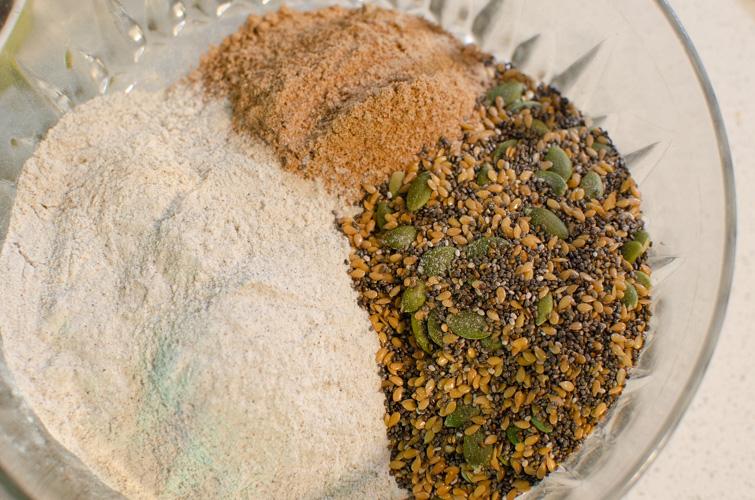 Mezclar los ingredientes secos. Semillas (pueden usar las que quieran), harinas, sal y bicarbonato.