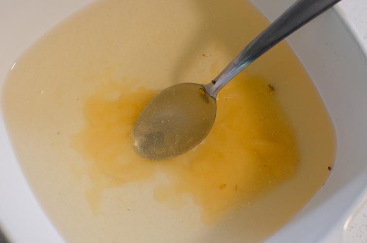 Disolver la cucharada de miel en una taza de agua tibia. Una vez disuelta agregar la segunda taza de agua y el vinagre de manzana. Mezclar bien.