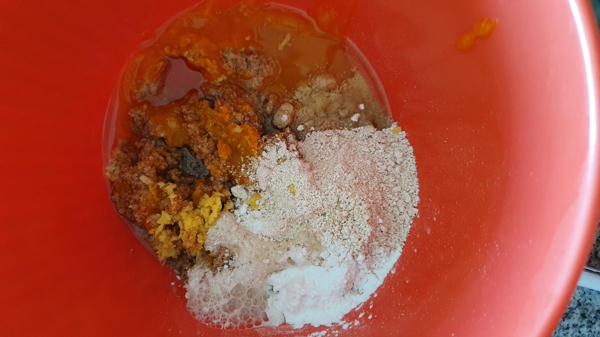 1.1. Pre calentar el horno. Cocer y moler el zapallo. En un recipiente mezclar el zapallo, las harinas, endulzante, polvos, vinagre y el aceite. Mezclar bien.