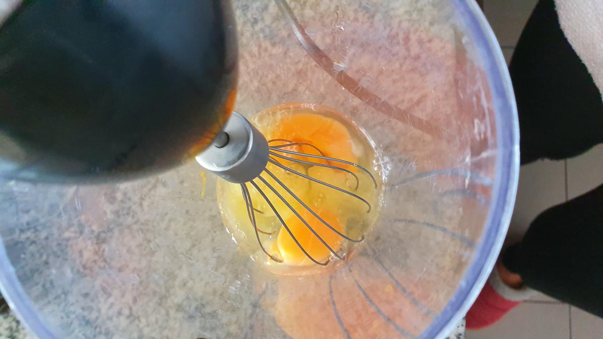 2. Batir los huevos juntos al jugo de naranja por unos segundos. Picar las nueces.