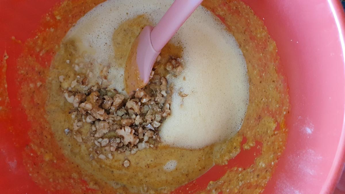 3. Agregar los huevos batidos a la mezcla de harinas y zapallo. Agregar las nueces picadas y el jengibre rallado. Idealmente mezclar con batidora eléctrica por un minuto, hasta que este todo mezclado e incorporado.