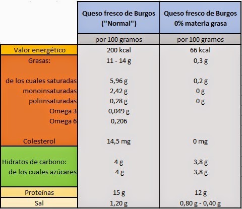 - Queso fresco de Burgos 0% Grasa: aprox 66 Kcal/100 g