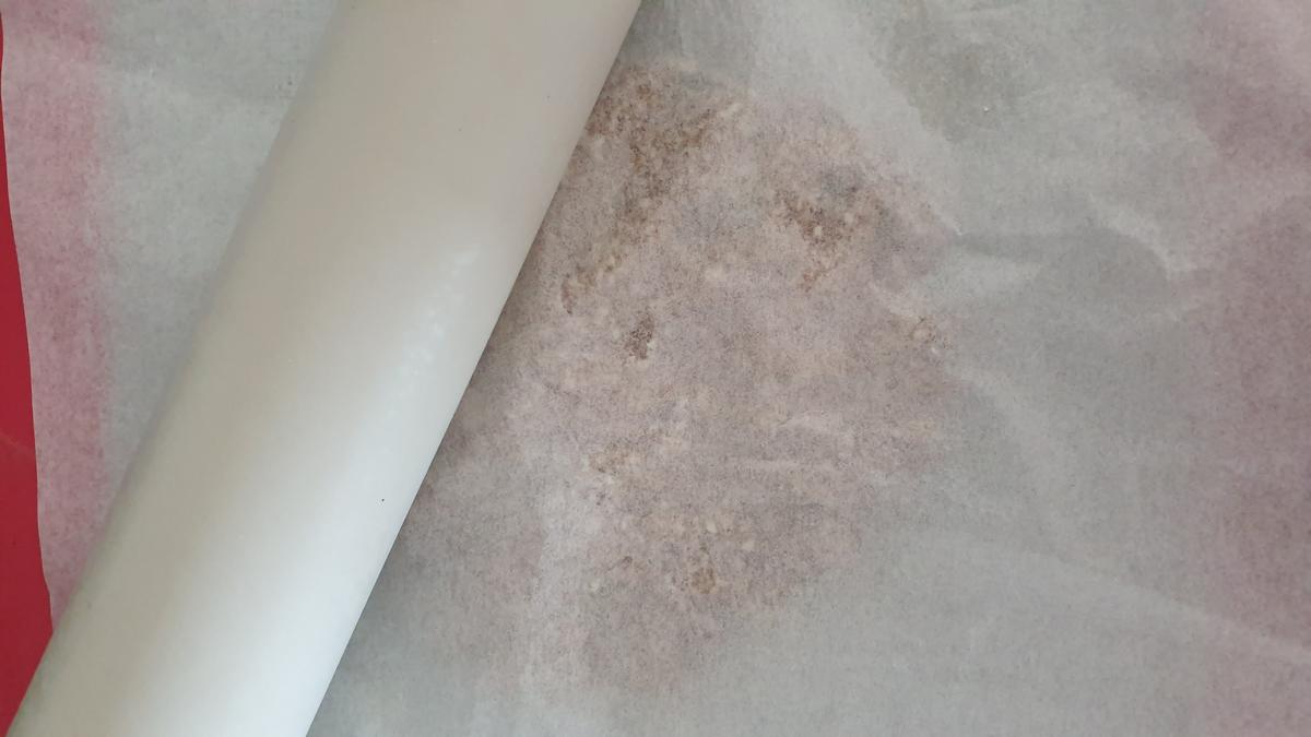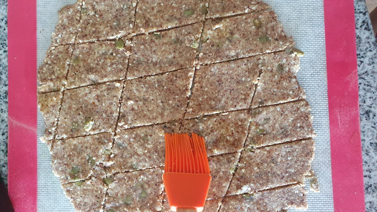 Poner la masa sobre un Mat de silicona apto para el horno, encima poner un trozo de papel mantequilla idealmente con un poquito de aceite. Uslear (aplanar) la masa sobre el papel hasta que logren una masa plana y delgada. Cortar la masa en rectángulos.