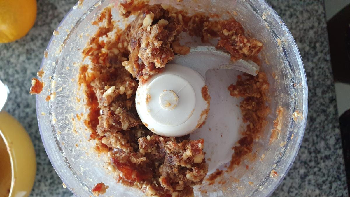 1.Remojar por unos minutos los dátiles en agua caliente. Luego procesarlos junto con las nueces y la ralladura de naranja hasta lograr una pasta. Refrigerar mientras preparamos el mousse.
