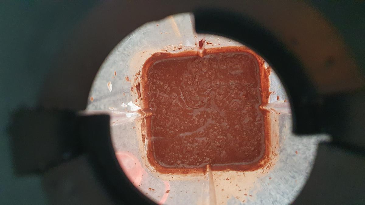 Poner en una licuadora las castañas remojadas, crema de coco, chocolate derretido, jugo de naranja, stevia y el cacao en polvo. Licuar hasta la lograr una mezcla homogenea y muy cremosa