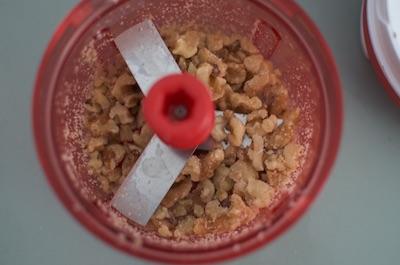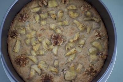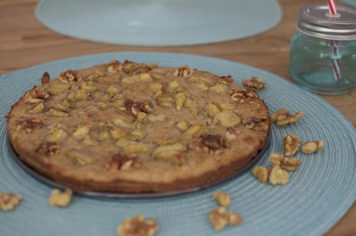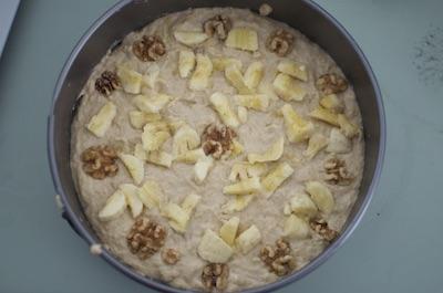 6. Agregar la mezcla en el molde y decorar con plátano picado y nueces enteras.