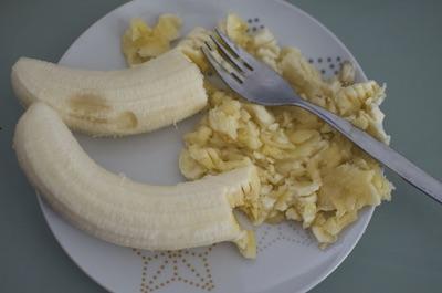 1. Pre calentar el horno. Con la ayuda de un tenedor moler el plátano.