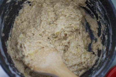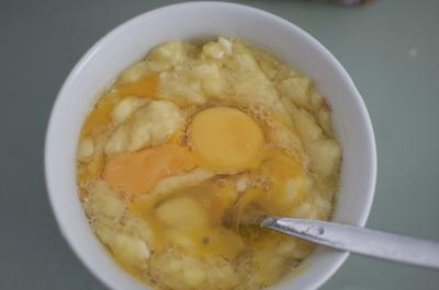 2. En un recipiente mezclar el plátano molido con los huevos.