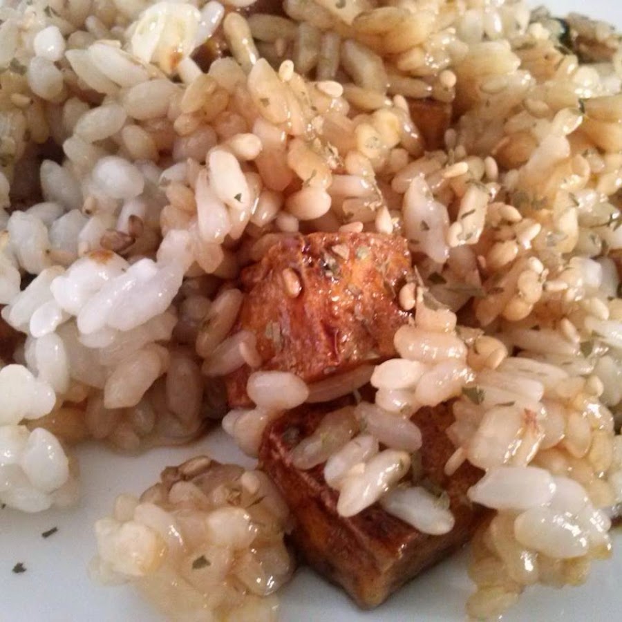 Una vez tengamos el tofu dorado, añadimos una cucharadita de semillas de sesamo y a continuacion soja liquida. Movemos para que se mezcle bien y la añadimos al arroz hervido que habiamos reservado.