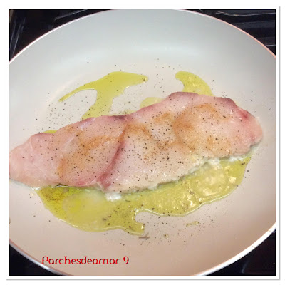 9- En una sartén colocar un chorrito de aceite de oliva y poner al fuego el filete de pescado con sal y pimienta y ajo en polvo nuevamente (agregar otra especie si gustas)