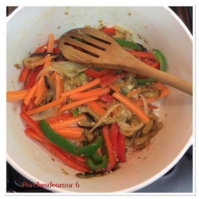6- Agregar la zanahoria en Juliana y dejar a que suavicen (si es necesario rosear con un poquito de agua)