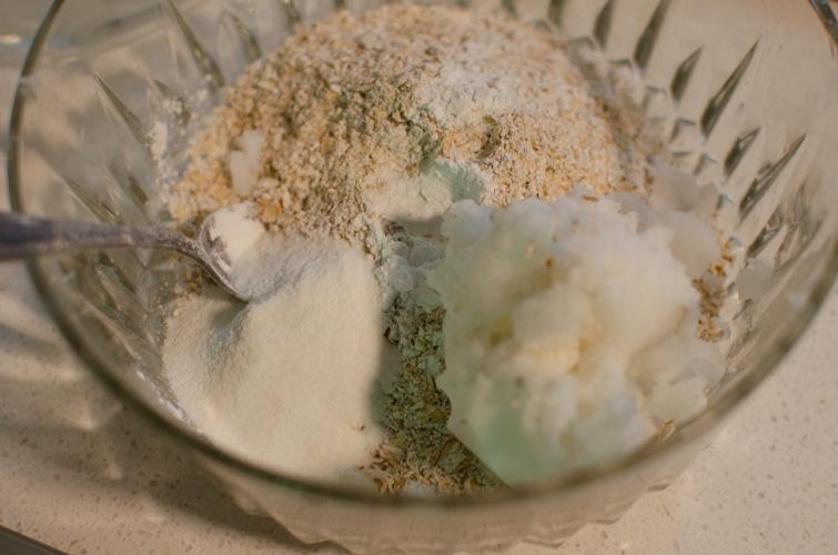 Mezclar la avena con las 5 cucharadas de aceite de coco solido, polvos de hornear, leche y endulzante. Mezclar bien con las manos, hasta lograr una masa.
