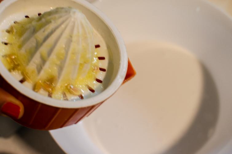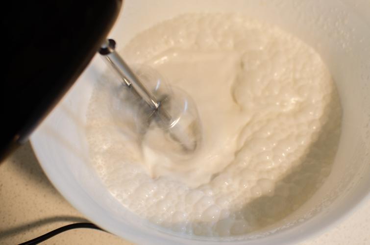 Poner la crema de coco en un recipiente. Exprimir el jugo de un limón y agregarlo a la mezcla. Comenzar a batir por 3 minutos con un batidor eléctrico. Agregar el endulzante y seguir batiendo.