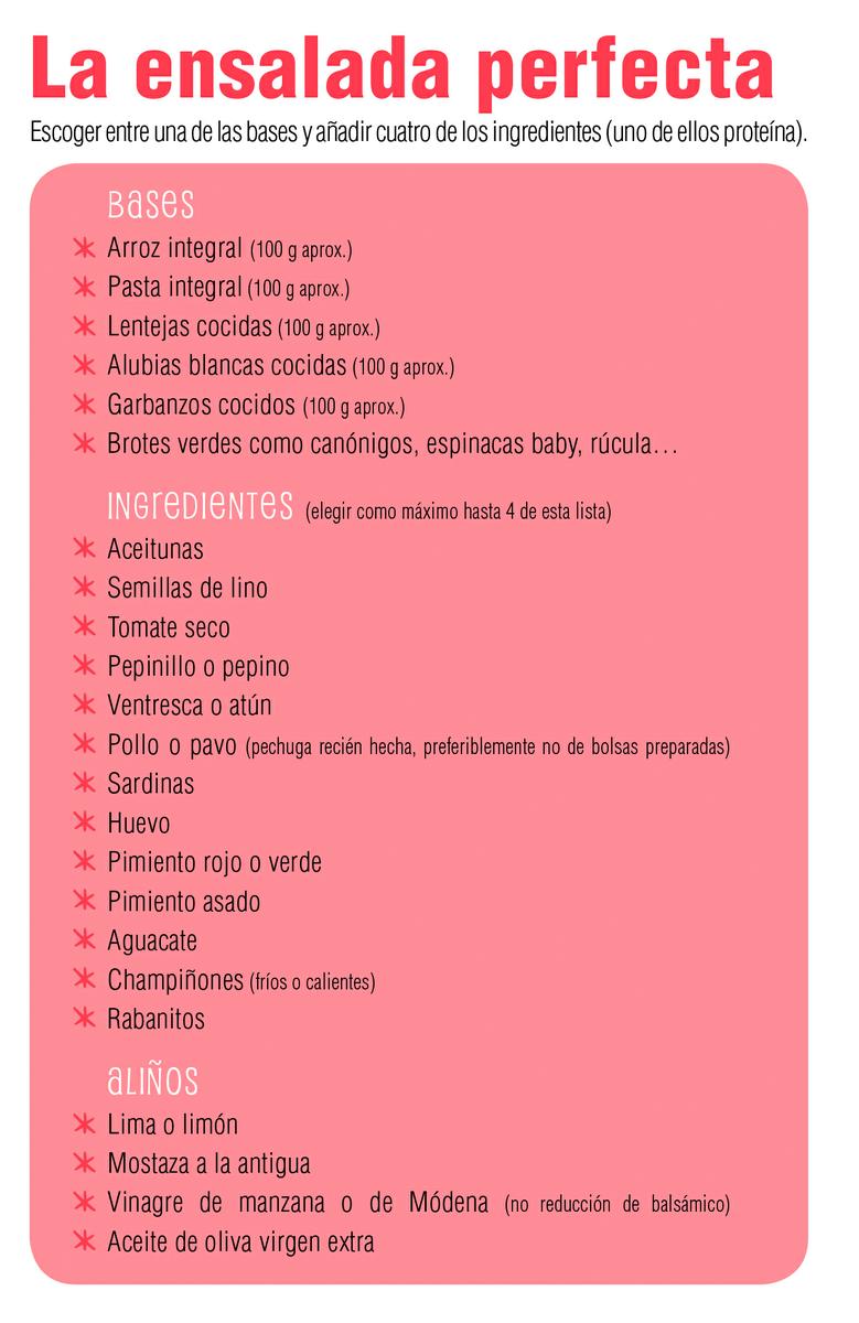 Una ensalada te saca de un apuro y las combinaciones son infinitas. ¿Sabes cómo hacer la mezcla perfecta? Pues muy fácil, escoge una base, añade cuatro ingredientes (uno que sea proteína) y un aliño. ¡Listo!