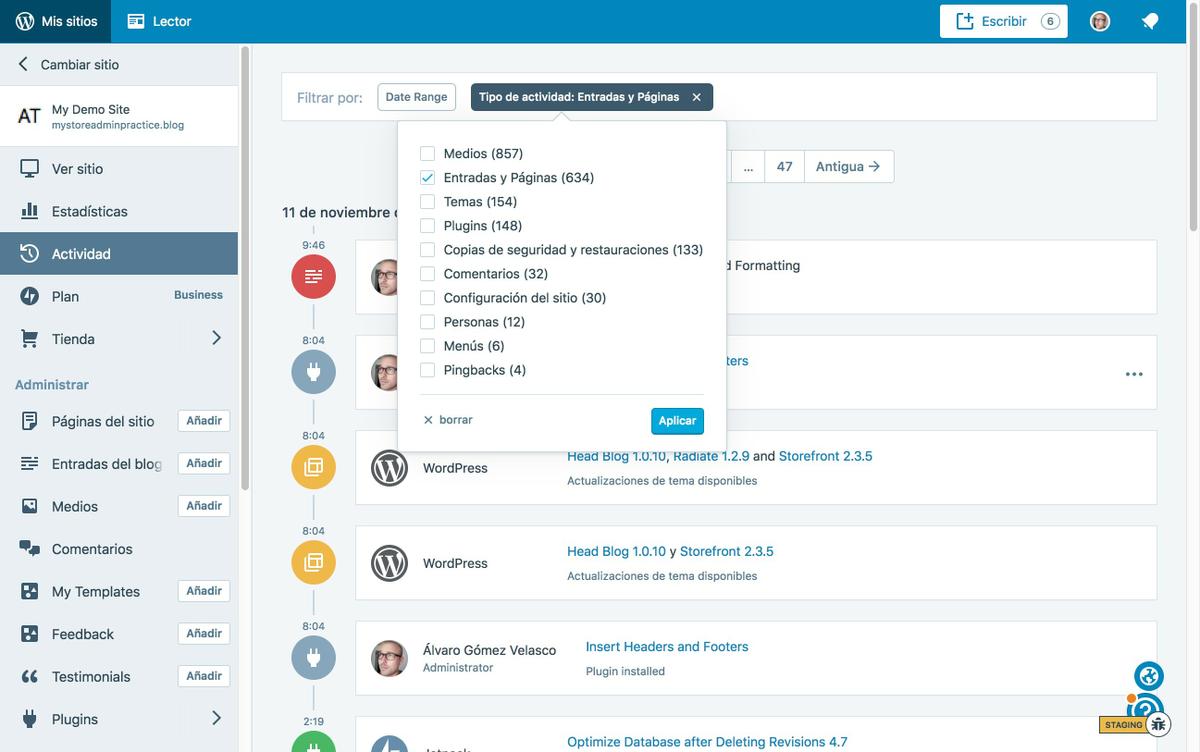 Si quieres puedes ir a Actividad y verás los 20 cambios o actualizaciones más recientes que se han hecho en tu sitio. En tus sitios de WordPress.com o en sitios conectados mediante Jetpack con un plan de pago verás todos los eventos de los últimos 30 días. En el caso de disponer de un plan Business (WordPress.com) o Professional (Jetpack) verás todos los eventos del último año.