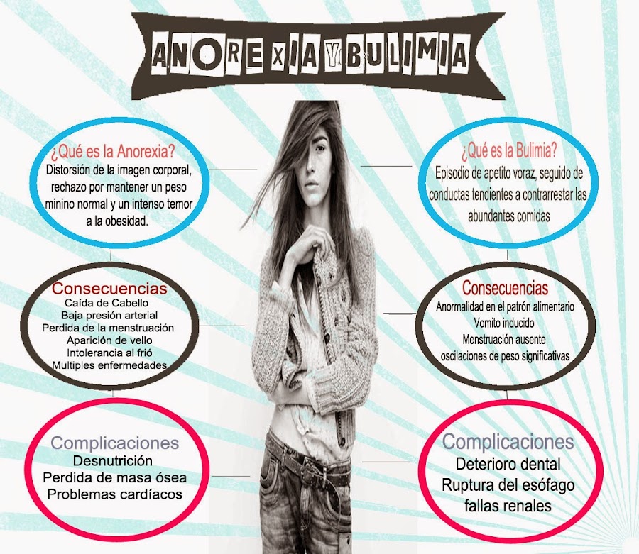 Las consecuencias de una bulimia pueden ser muy graves como : colon irritable, megacolon, reflujo gastrointertinal, hernia hiatal, perforación esofágica, pancreatitis, descenso de glucosa, cloro, calcio y potasio en sangre, arritmias, alteraciones genitales, óseas, renales...
