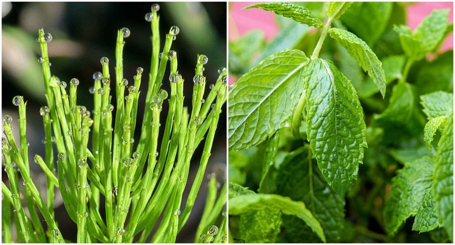 Infusión de menta y cola de caballo: calentar medio litro de agua hasta la primera ebullición y retirar del fuego. Añadir 30 gr de cada ingrediente, la menta y la cola de caballo, y dejar reposar durante unos 5 minutos. Colar y consumir.