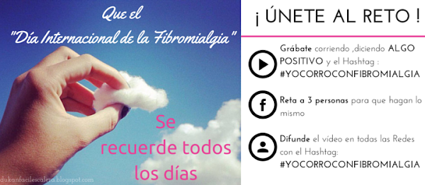 Hoy Martes día 12 de Mayo se celebra el " Día Internacional de la Fibromialgia " y quiero personalmente que con el siguiente RETO EN VÍDEO no solo sea un día especial del año ,sino que se recuerde todos los días, se haga conciencia y se conozca esta enfermedad "desconsiderada" e invisible que sufrimos personalmente y el rechazo por mucha gente porque somos tachados por "farsantes" ya que es una enfermedad que se sufre en nuestro interior ya que no se esterioriza o se nota frente a los demás si no nos quejamos.