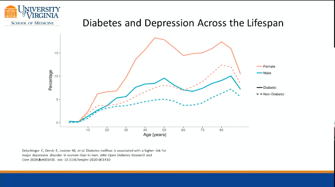 En el gráfico de arriba se muestra muy bien la relación entre la diabetes y la DEPRESIÓN a lo largo de los años, donde las líneas sólidas o continuas son las personas con diabetes (naranja mujeres y azul hombres) y las líneas punteadas son personas sin diabetes.