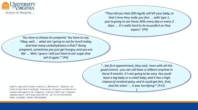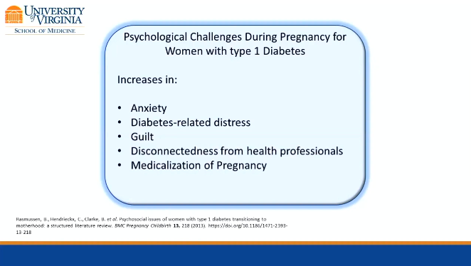 En una revisión de la literatura sobre los desafíos psicológicos durante el embarazo para mujeres con diabetes tipo 1, se encontró que, estas causas aumentan significativamente durante el embarazo, ya que no conseguir los objetivos de control genera angustia y culpa por no estar dando lo que se supone que es el 100% o lo mejor de ti para tu bebé.