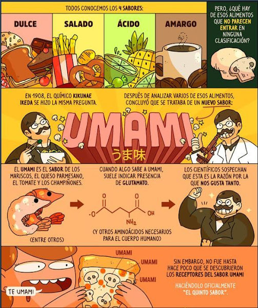 El umami (delicioso o sabroso en japonés) no era ni definitivamente dulce, ni amargo, salado o ácido. En el paladar producía una sensación gustativa diferente, como la que deja el jamón ibérico, las algas, la salsa de soja o el queso parmesano. Cuando se identificaron los receptores gustativos específicos en la lengua humana, el umami se convirtió en el quinto sabor.
