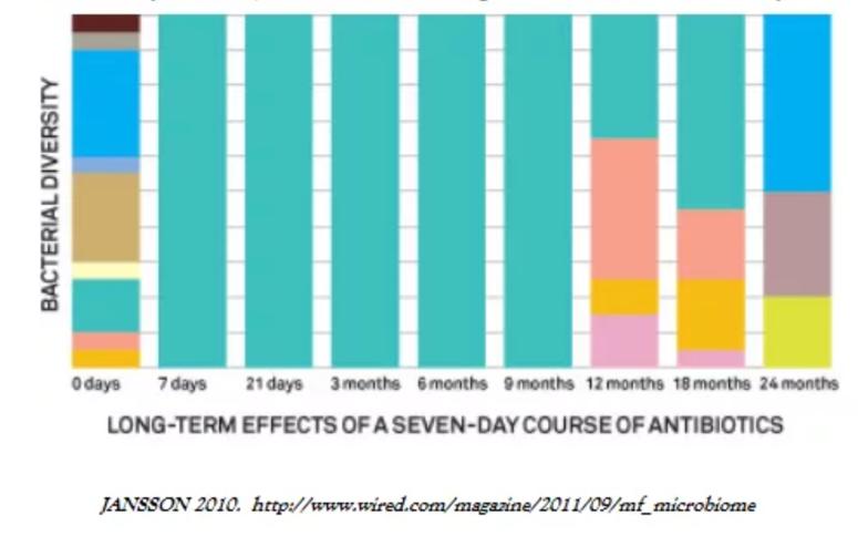 Matar moscas a cañonazos, no está mal pensado pero NO SIRVE. Hasta ahora el uso de antibióticos no ha servido para equilibrar la flora, de hecho desequilibran significativamente la flora intestinal. Para muestra un botón. Te muestro lo que pasa una vez te sometes a un tratamiento antibiótico con la flora intestinal (9 meses después sigues sin biodiversidad).- Los antibióticos no son la solución.