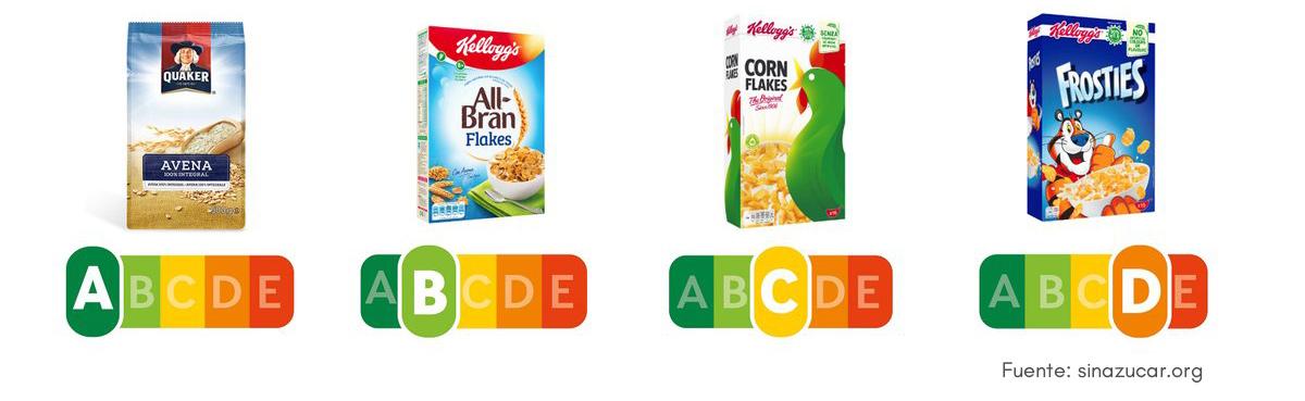 Cereales altamente azucarados: por un lado, su alto contenido en fibra les hace puntuar alto en elementos positivos, mientras que los azúcares les acercan al color rojo. Como resultado final muchos de estos productos acaban en un punto intermedio, a pesar de ser alimentos de riesgo con alto contenido en azúcar.
