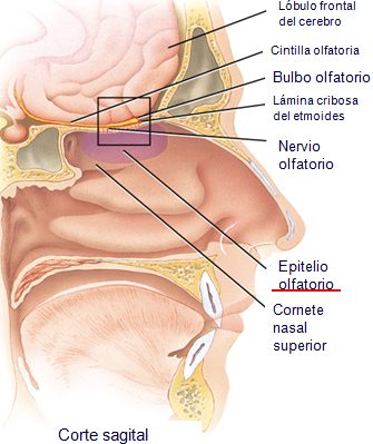El epitelio olfatorio o nasal está en la parte superior de la cavidad nasal (5 cm2).