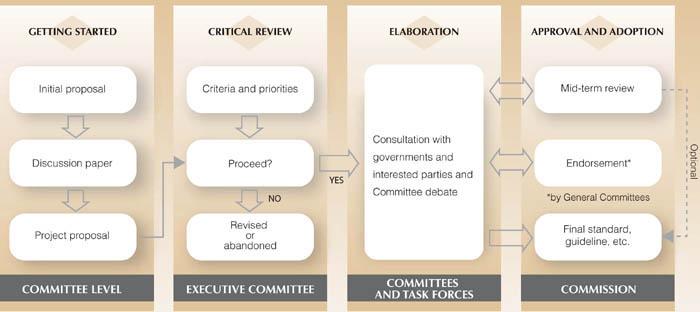 Los Comités de Especialistas y la Consultoría FAO/OMS (conferencias, consultas específicas y ad hoc) proveen las bases científicas para la elaboración de alimentos inocuos y saludables, así como las recomendaciones de calidad para el comercio internacional. La naturaleza de las normas del Códex tiene el objetivo de garantizar al consumidor un alimento sano, benéfico y libre de adulteraciones, correctamente rotulado y presentado. Los Comités del Codex pueden clasificarse en tres grupos: horizontales (que tratan temas que implican a todos los alimentos), verticales (que se ocupan de productos específicos) y regionales (África, Asia, Europa, Latinoamérica y el Caribe) y desarrollan los documentos que deberán ser aprobados por la Comisión del Códex.