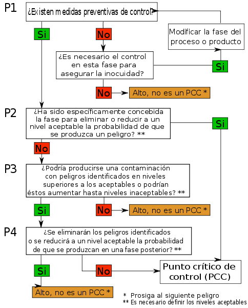 Realizar un análisis de peligros. Preparar una lista de todas las etapas del proceso donde los peligros significativos puedan suceder, y describir las medidas preventivas. El análisis de peligros es un elemento clave en el desarrollo del plan HACCP. Es esencial que ese proceso se conduzca de manera apropiada, pues la aplicación de los otros principios implica tareas que utilizan los resultados del análisis de los peligros. De ese modo, el análisis de peligros representa la base para la elaboración del plan HACCP. En las Directrices para Aplicación del Sistema de Análisis de Peligros y Puntos Críticos de Control (HACCP), el análisis de peligros se describe como "la colecta y evaluación de las informaciones sobre los peligros y las circunstancias que contribuyen a su presencia, para decidir cuáles son significativos para la inocuidad del alimento y que, por lo tanto, deben ser abordados en el plan HACCP".