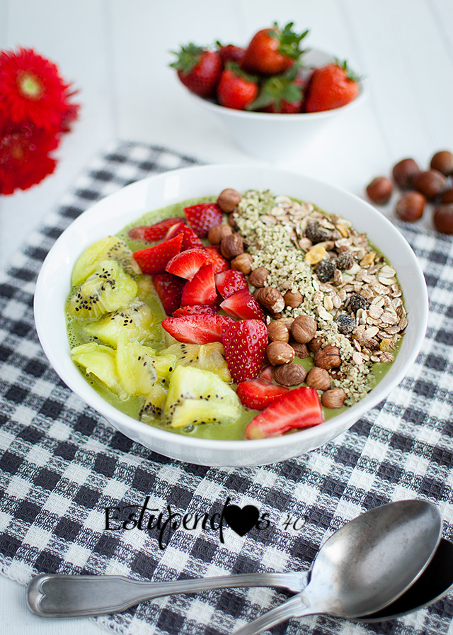 Metemos los ingredientes del smoothie en la batidora y trituramos hasta que queden bien integrados. Tiene que ser una textura espesita sin que llegue a parecer muy pesada.