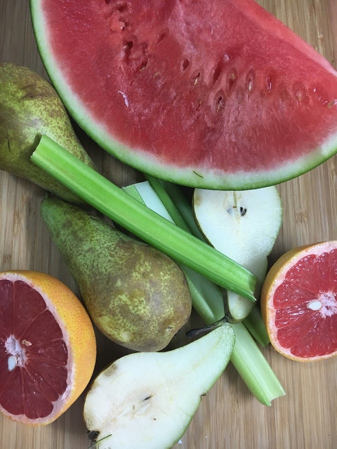 Se pelan las frutas y se cortan en trozos pequeños, despepitando en lo posible la sandía. Se lava el apio y se corta en rodajas.